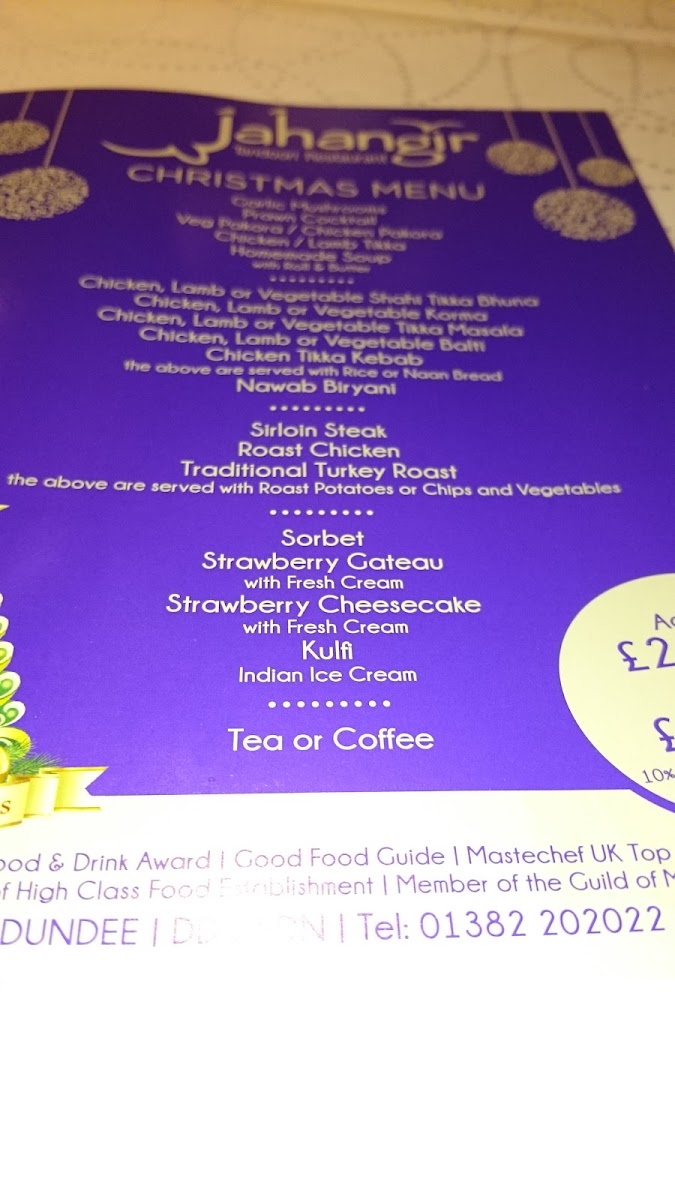 Welcome to Jahangir Tandoori, a culinary gem located at 1 Session St, Dundee. This vibrant restaurant boasts an impressive menu that caters to a diverse range of tastes. With options clearly labeled for meat, fish, and vegetables, even vegans can find delightful dishes with ease. Customers rave about the generous portion sizes and the exceptional flavors that accompany each meal.